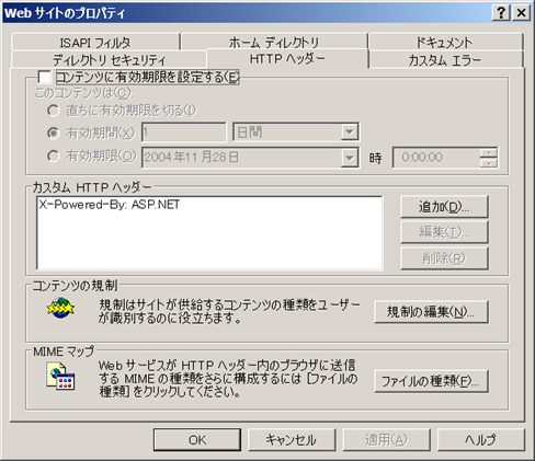 「WEBサイトのプロパティ」が開くので、「HTTPヘッダー」をクリックすると下の画面になります。